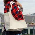 シンプルなデザインで何にでも合わせやすく、汚れたら、気軽にお洗濯のできるトートバッグ。大容量で使いやすいうえ、肩に掛けても食い込まないので、お買い物の疲れを軽減できます。
